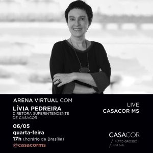 Nesta quarta-feira (06), às 16h MS, acontece mais uma edição do Arena Virtual CASACOR MS. A diretora Executiva da marca em Mato Grosso do Sul, Tatiana Ratier, estará ao vivo no perfil oficial do Instagram da mostra (@casacorms), para conversar com a diretora superintendente da rede CASACOR, Lívia Pedreira.