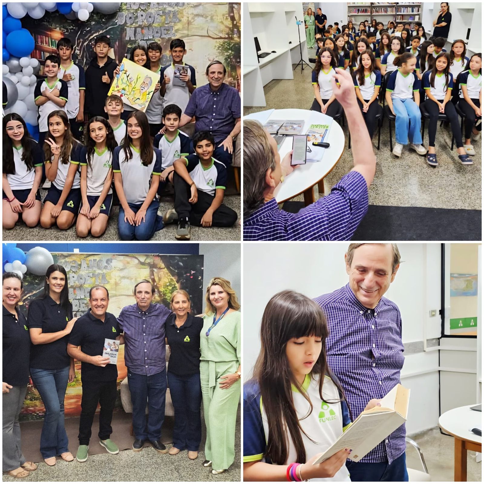 As atividades contaram com uma palestra do jornalista e escritor Bosco Martins, autor do livro “Diálogos do Ócio”, para cerca de 300 alunos do 5º ano do Colégio Oswaldo Tognini (Funlec). Os estudantes celebraram o poeta com desenhos e poesia inspirados em sua literatura. O livro de Martins é referência para estudiosos e tem testemunhado a imersão de jovens na obra de Barros, também observada em outras instituições, como a Escola Municipal Oliva Enciso. Lá, uma exposição reuniu versos, desenhos, objetos e móveis que reproduziam o ambiente do poeta, incluindo o sofá e a icônica máquina de escrever sobre sua escrivaninha.